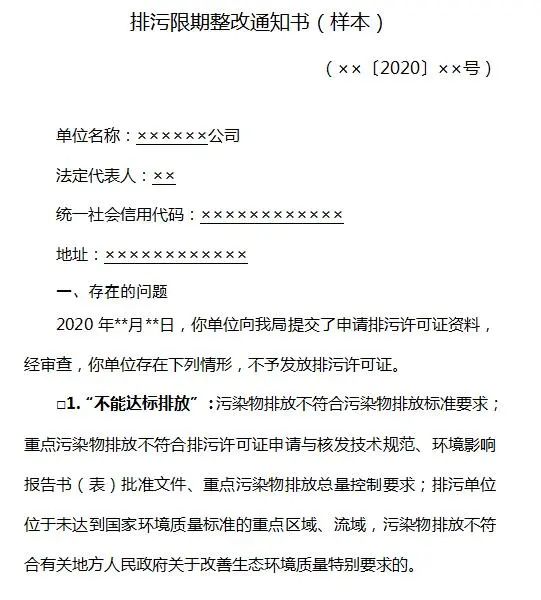(一)正文。內容包括排污單位名稱、法定代表人或者主要負責人、生產經營場所所在地、統一社會信用代碼等企業基本信息,載明整改問題類型和整改時限,告知排污單位整改要求和逾期未完成整改的法律后果。