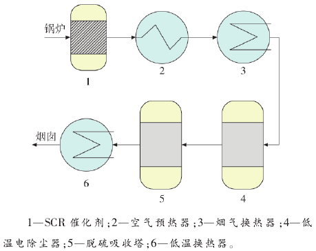 當前燃煤鍋爐環保系統的主要設備流程布置方式為:脫硝裝置+空氣預熱器+煙氣換熱器+除塵器(+低溫加熱器)+脫硫裝置,見圖1。